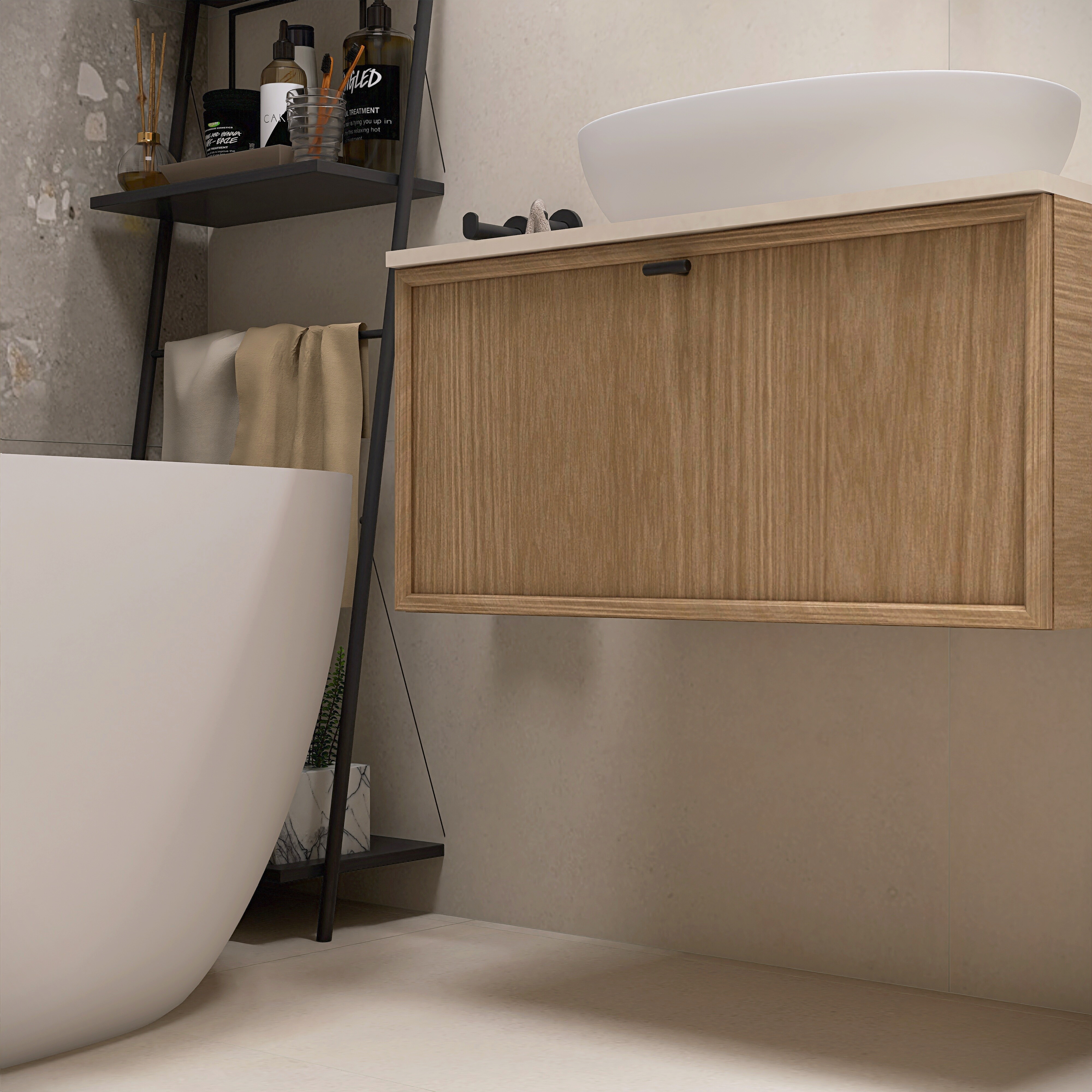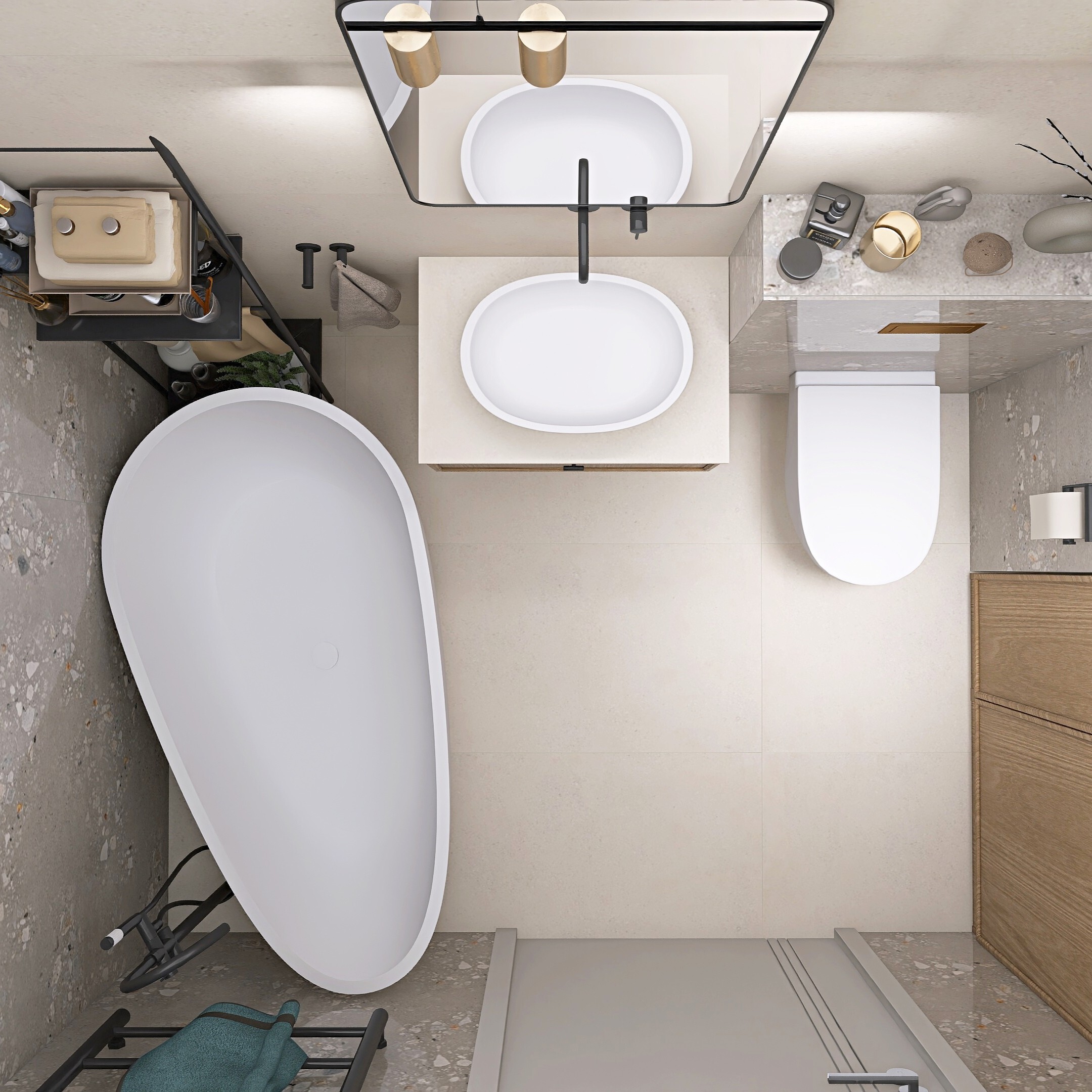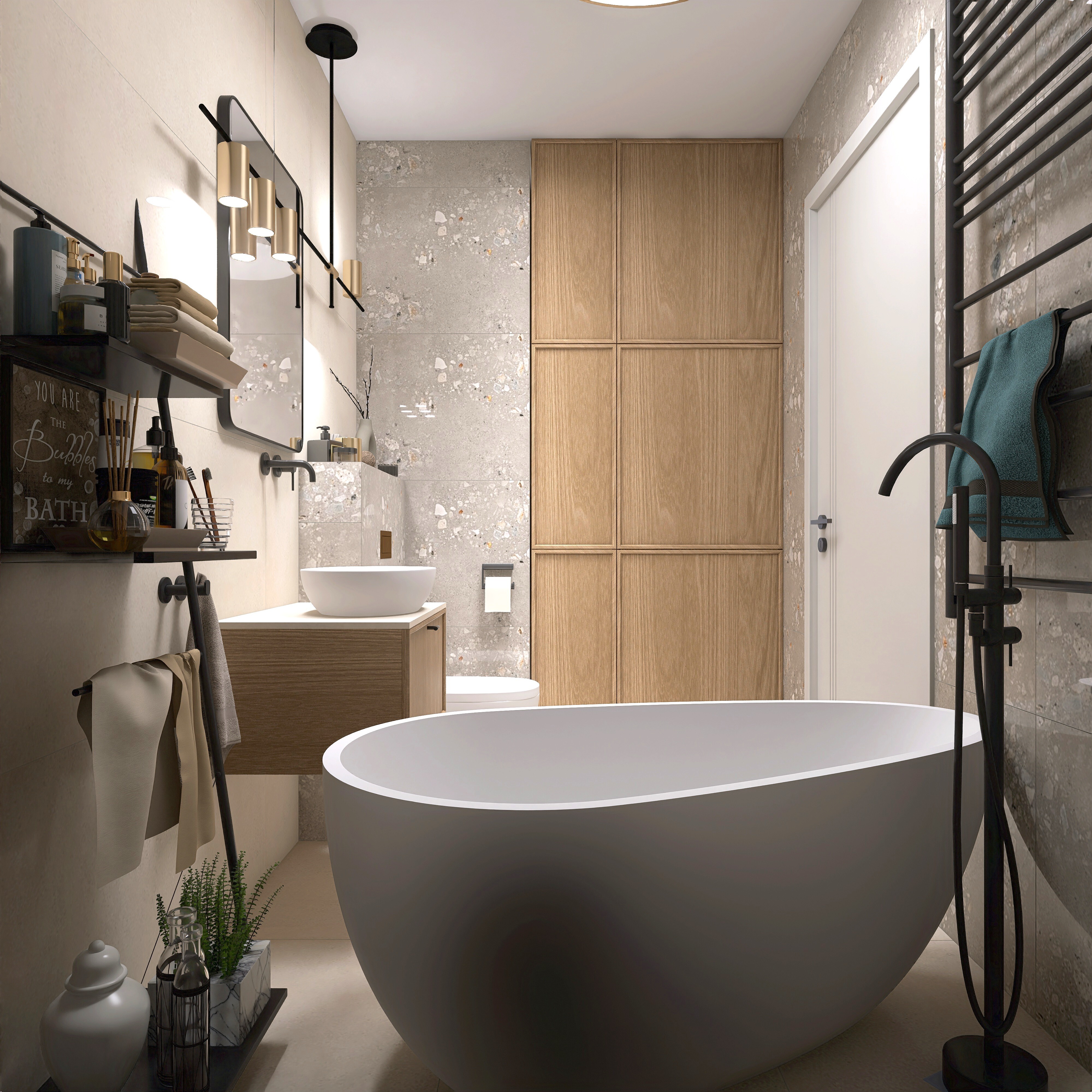 Projekt tej niewielkiej łazienki to dowód na to, że nawet na kilku metrach można stworzyć przestrzeń funkcjonalną, przytulną i elegancką. Kluczem okazało się połączenie naturalnych materiałów, ciepłych barw oraz przemyślanych rozwiązań. Centralnym punktem aranżacji jest wolnostojąca wanna, która pomimo niewielkich rozmiarów, nadaje pomieszczeniu charakteru i zapewnia prawdziwy relaks na co dzień.